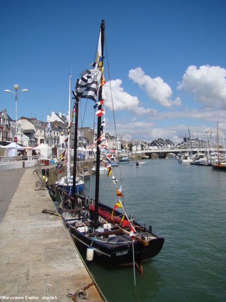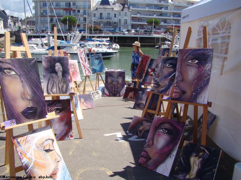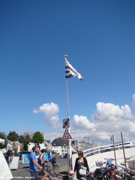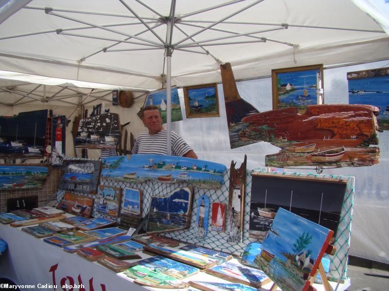On remarque tout de suite en arrivant le drapeau breton au coin du vieux pont - celui-là est à poste toute l'année. Dans la grand rue en face, rue général Leclerc en direction du Croisic, un magasin a pavoisé avec deux gwenn ha du. Pour la fête, le port est pavoisé de 8 ou 10 autres drapeaux bretons. On apprécie le grand pavois avec un grand gwenn ha du sur la chaloupe sardinière. De forme et mâture très proches du sinagot, elle a été reconstruite à l'identique d'un vieux gréement présent dans le port en 1890, pour participer aux fêtes maritimes de 1992 à Brest, sur la demande de la municipalité de l'époque. Elle y a gagné un prix du concours des vieux gréements reconstruits à l'identique par l'association Chasse Marée. Elle est entretenue, et pilotée pour des promenades en mer, par l'association La Chaloupe sardinière (3).Des stands divers sont installés tout le long du port avec des objets artisanaux, des produits du terroir... Des peintres exposent leurs oeuvres, comme Cel (4) et Tomy (5) (voir photos). On remarque aussi le très long stand de l'association Bretagne Réunie (6) qui propose la pétition des 100.000 (7) à signer par les électeurs de Loire-Atlantique.