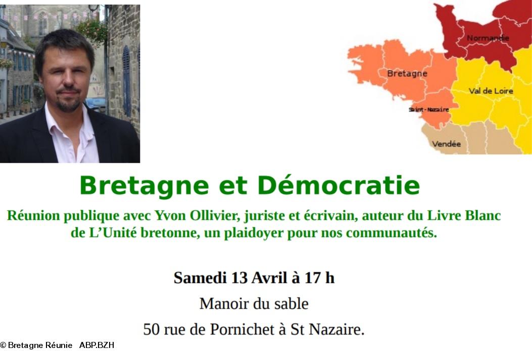 Il vous convie à la conférence-débat qui aura lieu samedi 13 avril à 17h à Saint-Nazaire avec Yvon Ollivier, juriste et écrivain, auteur entre autres du Livre blanc de l'unité bretonne avec le thème : Bretagne et démocratie. Elle aura lieu au Manoir du Sable 50 rue de Pornichet à Saint-Nazaire. Entrée libre.